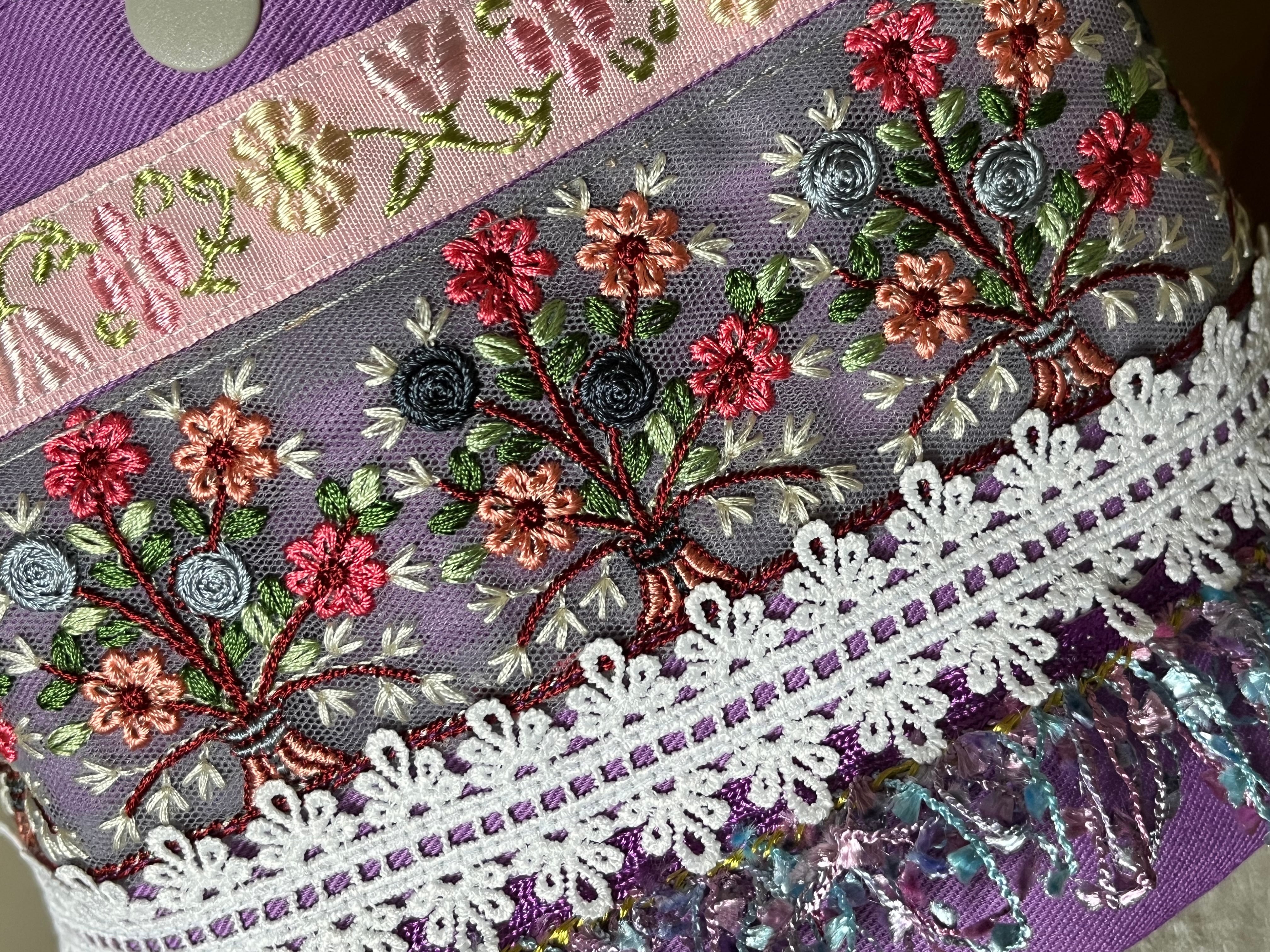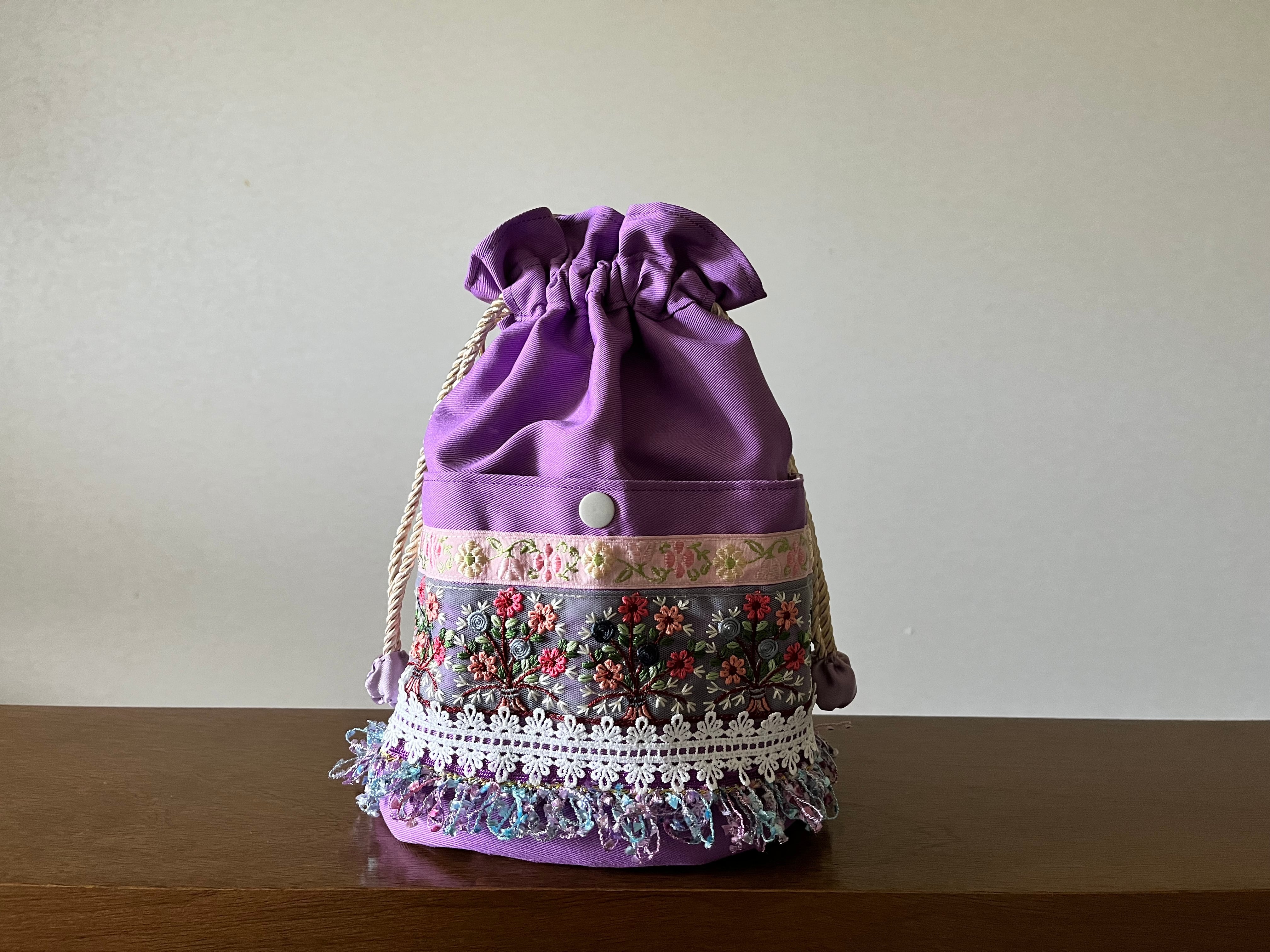 美しいパープル色と華やかな花の刺繍が施されており、ショルダーベルトは長さの調節可能です。